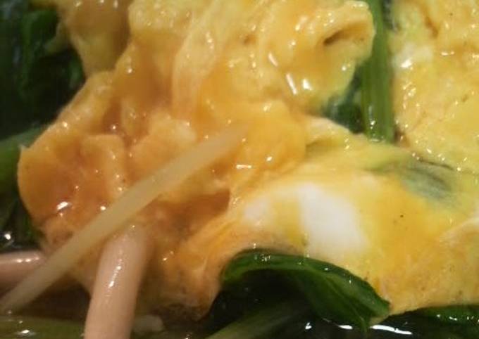 Simple Way to Make Award-winning Soft Egg Omelet and Komatsuna Spinach with Thickened Chinese Style Sauce